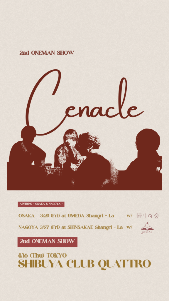 4月16日(木) SHIBUYA CLUB QUATTROにて2nd ONE MAN SHOW 「Cenacle」を開催!またワンマン公演に先駆けて、名阪2マン企画として開催する「APEIRING 2026 – OSAKA & NAGOYA-」公演のゲストバンドを発表!3月20日(金・祝) 大阪 梅田Shangri-La公演ではBa.高田真路が楽曲のアレンジにも参加した4人組ロックバンド「帰りの会」、3月27日(金) 名古屋 新栄Shangri-La公演は昨今の音楽シーンでも話題のニューカマーとなっている「goethe」の出演が決定!全公演のチケット一般販売(先着)を2/7(土)10:00〜受付開始!即ソールドアウトとなった初のワンマンの続き、更にスケールをあげたchef’sのステージをお楽しみ下さい。